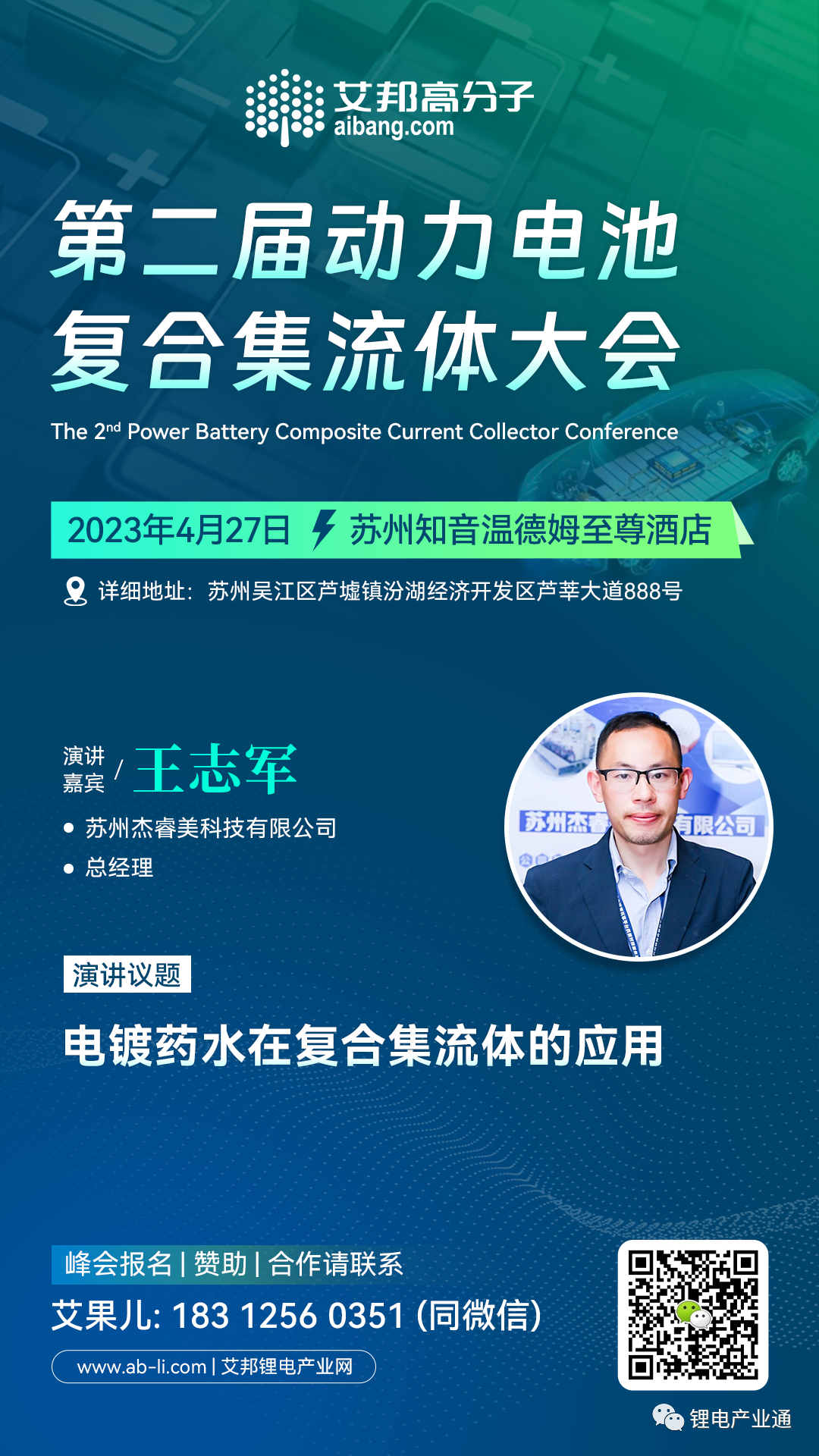 艾邦将于4月27日在苏州举办第二届动力电池复合集流体大会,届时苏州杰睿美将给大家带来电镀药水在复合集流体的应用主题演讲,敬请期待!